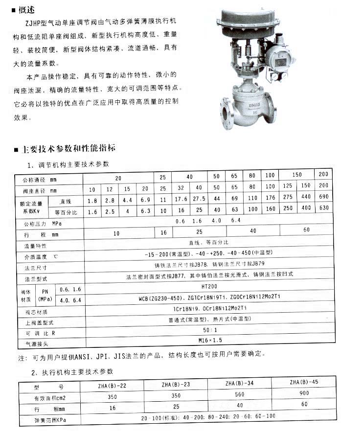 ZJHP型氣動(dòng)單座調(diào)節(jié)閥由氣動(dòng)多彈簧薄膜執(zhí)行機(jī)構(gòu)和低流阻單座閥組成。新型執(zhí)行機(jī)構(gòu)高度低、重量輕、裝校簡便,新型閥體結(jié)構(gòu)緊湊、流道通暢,具有大的流量系數(shù)。